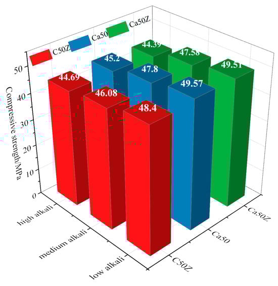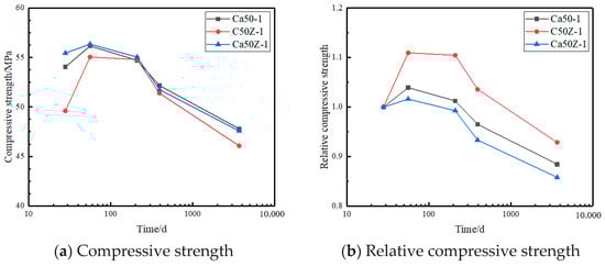 Figure 6 shows the compressive strengths of C50Z-1, Ca50-1, and Ca50Z-1 under immersion in standard alkali solution at 38 °C at intervals of 0 days, 28 days, 182 days, 365 days, and 3650 days. For C50Z-1, the compressive strengths were 49.61 MPa, 55.05 MPa, 54.8 MPa, 51.39 MPa, and 46.08 MPa, respectively; for Ca50-1, they were 54.04 MPa, 56.17 MPa, 54.71 MPa, 52.17 MPa, and 47.8 MPa, respectively; and for Ca50Z-1, they were 55.45 MPa, 56.35 MPa, 55.05 MPa, 51.76 MPa, and 47.58 MPa, respectively. The compressive strength of the HPC generally increased when soaked for 28 days compared to the initial compressive strength, followed by a decreasing trend after 182 days. The increase in strength observed in the first 100 days of exposure to an aggressive environment is possibly associated with the accumulation of the products of interactions between the cement stone and the aggressive environment, which is convincingly shown in reference []. This indicates that the compressive strength of HPC immersed in standard alkali solution at 38 °C for a year undergoes an initial increase followed by a decline. The compressive strength of most mixtures reaches its peak after the 28-day immersion treatment, subsequently showing a continual decrease. The reduction in compressive strength from its peak to the values observed after 10 years of immersion is calculated as 16.29%, 14.90%, and 15.56% for C50Z, Ca50, and Ca50Z, respectively.