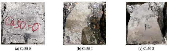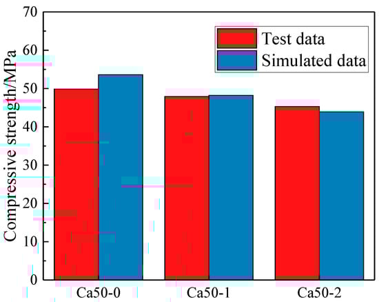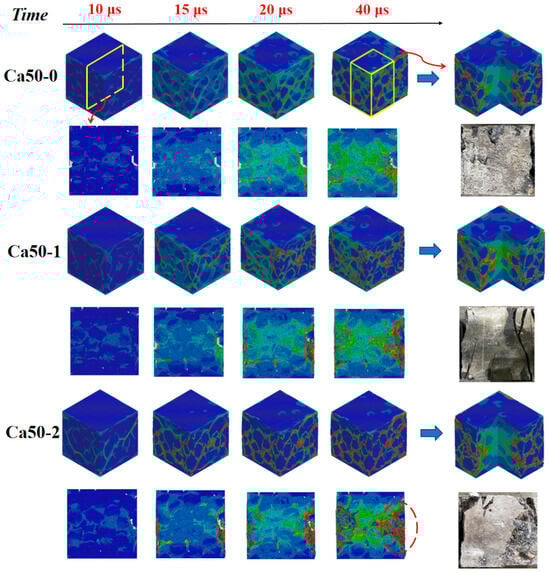 Experimental and numerical simulation comparative analyses were carried out. Based on the stress–strain curves obtained through numerical simulation, it is evident that the peak stresses for Ca50-0, Ca50-1, and Ca50-2 exhibit discrepancies when compared to the experimental results, as shown in Figure 14. The respective errors are +7.6%, +0.6%, and −3.1%. The overall errors are relatively small, which could be attributed to potential systematic or incidental errors in the experimental setup. The primary model material parameters were derived through fitted relationships, which might introduce computational errors.