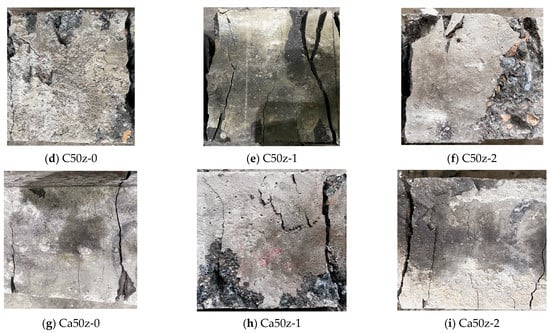 Figure 8 shows the damage patterns of HPC under different conditions. It can be seen that as the equivalent alkali content increases, the damage morphology of the specimens becomes more severe. At the lowest alkali content, the surface of the specimens remains relatively intact with few cracks. As the alkali content increases, extensive spalling and a greater number of wider cracks appear on the specimen surfaces, with the similar damage mode of OPC. At high alkali levels, the characteristics of the damage are similar to those at moderate alkali levels, except for variations in surface spalling. It is also observable from the figure that under high alkali conditions, specimens with a single additive exhibit more severe damage, whereas those with two additives, like Ca50z, show relatively less damage.
