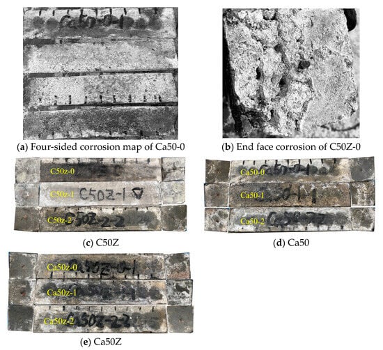 After long-term immersion in standard alkali solution, all the groups of specimens exhibited phenomena such as peeling of the surface mortar layer, detachment of fine aggregates, and exposure of coarse aggregates, as shown in Figure 9. In severely damaged specimens, end-face corrosion defects appeared on the concrete surface, as depicted in Figure 9. No typical features of ASR damage, such as map cracking, were observed on the surfaces of the specimens, indicating that the phenomenon of ASR damage is not pronounced in HPC under long-term conditions.