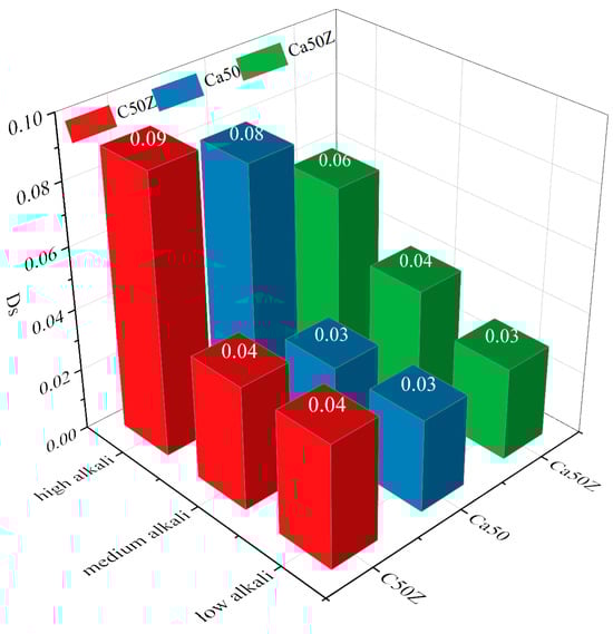 Figure 5 reveals that under low-alkali conditions, the specimens with only air-entraining agents exhibited a higher rate of expansion in the early stages of immersion. During the mid-immersion period, the specimens with both air-entraining agents and corrosion inhibitors reached the highest expansion rates, while those with only corrosion inhibitors maintained the lowest expansion rates across all the immersion times among the three admixture addition methods. In the moderate and high-alkali conditions, the specimens with only corrosion inhibitors and those with both air-entraining agents and corrosion inhibitors exhibited similar early expansion rates and values, whereas the specimens with only air-entraining agents consistently showed significantly lower expansion rates during all the immersion periods compared to the other two admixture strategies.
