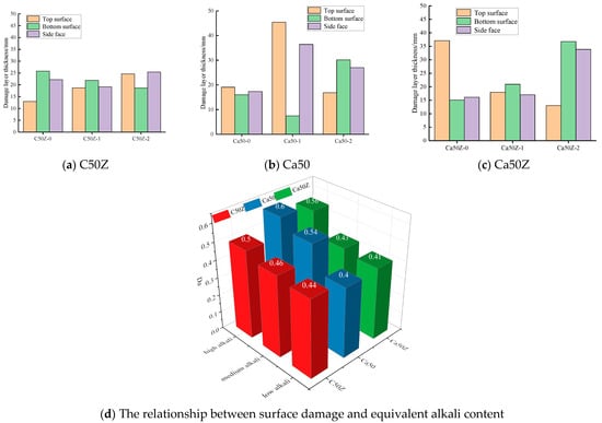 The thickness distribution of the four surface damage layers of HPC and the relationship between the degree of surface damage and the equivalent alkali content.