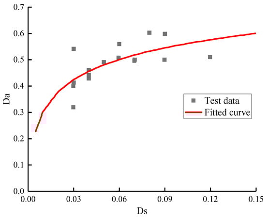 To investigate whether there is a correlation between internal damage variables and surface damage variables under long-term ASR conditions, data for both types of damage variables were collectively analyzed and are presented in Figure 12. The relationship between these two damage variables was subsequently determined and is described in Equation (7).