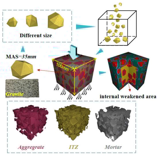 As computer technology has rapidly advanced, researchers have begun to employ numerical simulation techniques supported by high-performance computers to study the unobservable damage phenomena and mechanisms that occur within concrete []. Concrete is a heterogeneous multiphase composite consisting of coarse and fine aggregates, cement, and water, and it is often modeled as a three-phase composite material, including aggregates, the interfacial transition zone (ITZ), and mortar. Numerous scholars have incrementally shifted their research focus from homogeneous models to more diverse mesoscopic models [,,,], thereby upgrading and improving these models to capture a broader spectrum of material complexities.