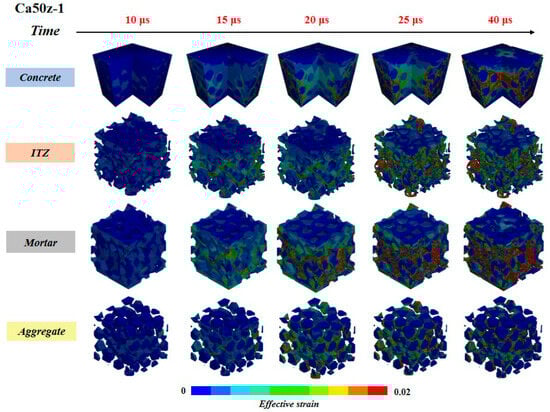 At the microscale level, concrete is composed of aggregates, mortar, and the ITZ, each displaying distinct mechanical characteristics. An exploration of the mechanical properties of these components under uniaxial compression is essential to understand the overall macroscopic mechanical properties of concrete. In Figure 16, which features mixture Ca50z-1, the failure morphology and progression of aggregates, mortar, and ITZ are depicted at specific time points: 10 μs, 15 μs, 20 μs, 25 μs, and 40 μs. Minimal damage to the aggregates and localized failure, mainly in the central region of the mortar, are observed under the load. The most extensive damage is sustained by the ITZ, positioned at the edges of the aggregates, underscoring its role as a critical transitional area between the aggregates and the mortar. By 15 μs, minor strains are noticeable in the center of the mortar and ITZ, with notably higher strain levels in the ITZ due to its comparatively weaker mechanical properties. Initial damage occurs primarily within the mortar, intensifying at the interfaces. As the simulation progresses, cracks develop and merge. By 40 μs, the ITZ is substantially compromised, confirming it as the weakest region within the concrete structure.