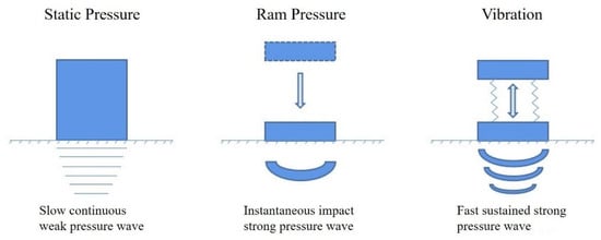 Currently, with the utilization of large-scale rolling construction machinery, the determination of the filling standard for gravel filling bodies is gradually transitioning from indoor to on-site [,]. The large-scale density bucket method is employed to design the grading envelope according to the gravel material, and the air-dried gravel material is artificially prepared for testing. The compaction principles of different compaction methods are illustrated in Figure 1.