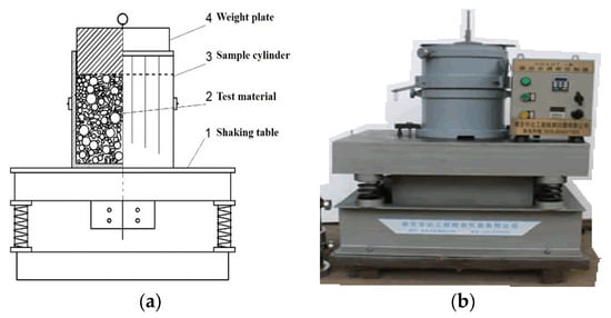 For the same grading of the gravel material, even with the same-sized specimen cylinder, due to the test of vibration compaction mechanism being different, the test results are not the same []. In order to study the effect of compaction methods on the relative density index, we conducted relative density tests on typical engineering dam-building gravel using the shaking table method and the surface vibration method, as shown in Figure 2. Both the shaking table method and the surface vibration method generally rely on the vibration of an electric motor to compact the test soil material, but the vibration compaction mechanisms of the two methods are not exactly the same []. In the shaking table method, the whole soil sample is restrained by the top weight plate, and at the same time is subjected to the inertia force generated by the vertical high-frequency vibration, which prompts the internal particles of the test material to adjust their positions to achieve compaction. The surface vibration method is conducted by exerting the vibrating rammer excitation force directly on the surface of the test material in the specimen cylinder; the surface of the excitation force from the top down on the test material particles produces an extrusion effect to achieve the effect of compaction. The test results are shown in Table 2. Therefore, from the point of view of the compaction mechanism and effect, under the premise of the same compaction work, the surface vibration method has a better compaction effect on the test material, and the maximum dry density obtained from the test is greater than that of the vibrating table method.