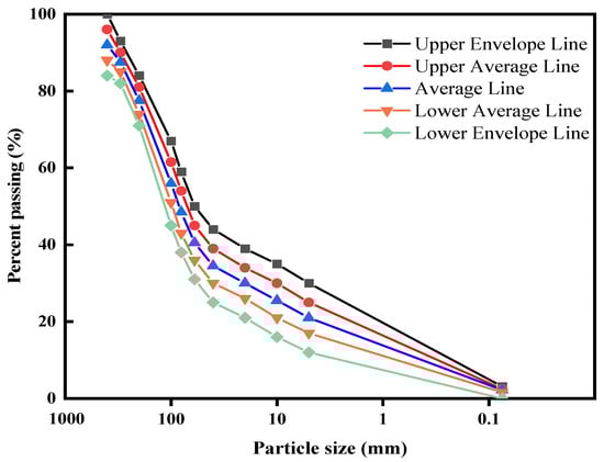 The five characteristic gradation curves chosen for the tests were the upper packet gradation line [], the lower packet gradation line, the average gradation line, the upper average gradation line, and the lower average gradation line, which also characterize the five different gravel contents. The maximum and minimum dry density tests were carried out twice for the different gravel content, and after the tests were completed for the five characteristic gradations (gravel content), the optimum gravel content was prepared again according to the optimum gravel content determined from the review tests. The grading curves of the test soil materials are shown in Figure 3.