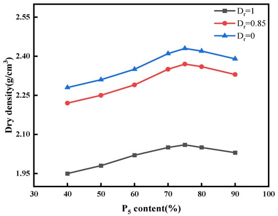 Based on the DL/T 5356-2006 Code for Coarse-Grained Soil Test, a three-factor plot of ρd-P5-Dr (dry density, gravel content, and relative density) of dam-building gravel materials for the asphalt concrete core wall dam at Bamudun was drawn, as shown in Figure 5. In the three-factor diagram, the maximum and minimum dry density values of different grades (gravel content) and the absolute dry density values corresponding to different relative densities are shown, which can be used as the evaluation criteria for evaluating the crushing quality of dam construction gravel. In this test, the maximum dry density is 2.43 g/cm3, and the corresponding minimum dry density is 2.06 g/cm3, which is obtained by using the upper average line of the original gradation of the stockpile, and the maximum dry density is 2.06 g/cm3. It can be seen in Figure 5 that the values of the maximum and minimum dry density of the sand and gravel material show a trend of increasing first and decreasing later, and the optimum gravel content is characterized by the highest compacted density. The optimum gravel content, corresponding to the maximum dry density, is 75%.
