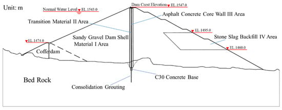 Bamudun Reservoir Engineering is located in Hami, Xinjiang Province, China. The dam is an asphalt concrete core wall dam, and the maximum section is selected for the study, as shown in Figure 6. The dam crest elevation is 1547 m, the maximum height of the dam is 128 m, and the width of the dam crest is 10 m. The upstream cofferdam is combined with the dam body, and the slope of the cofferdam is 1:2.0, and that of the dam body is 1:2.25 above the elevation of 1474 m, and the slope of the downstream section of the largest section is about 1:2.01. The dam body is divided into a gravel material area, a transition material area, an asphalt concrete area, a transition material area, and a drainage material area from upstream to downstream. The valley where the dam is located is in the shape of “V”, with a riverbed width of 20~100 cm and a specific drop of 6.5~7.5%.