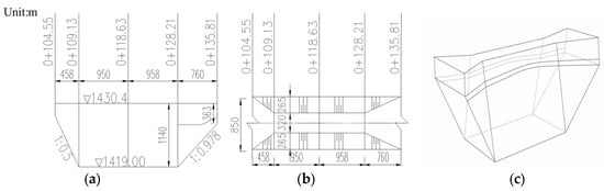 Concrete gravity wall base. (a) Front view; (b) Top view; (c) 3D perspective view.