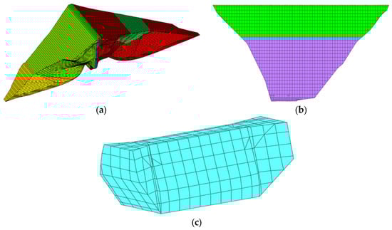 Three-dimensional finite element meshes. (a) Three-dimensional finite element mesh of dam; (b) three-dimensional finite element mesh of core wall; (c) the finite element mesh of the base at the bottom of the valley.
