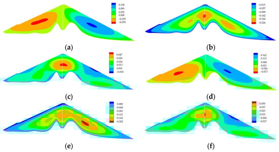 Dam displacement cloud map. (a) section 0 + 91.9 completion period dam along the river displacement (unit: m); (b) section 0 + 91.9 the vertical displacement of the dam during the completion period (unit: m); (c) section 0 + 91.9 completion period dam axial displacement; (d) section 0 + 91.9 full storage period dam along the river displacement; (e) section 0 + 91.9 full storage period dam vertical displacement; and (f) section 0 + 91.9 full storage period dam axial displacement.