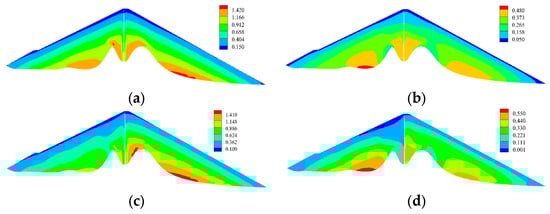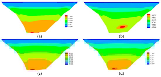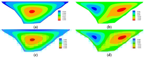The displacement cloud map of the core wall. (a) Vertical displacement of core wall during completion period (unit: m); (b) axial displacement of core wall dam during completion period; (c) vertical displacement of core wall in full storage period; and (d) axial displacement of core wall dam in full storage period.