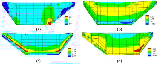 Stress distribution of base (unit: MPa). (a) Major principal stress at the end of construction; (b) minor principal stress after dam impounding; (c) major principal stress at the end of construction; and (d) minor principal stress after dam impounding.
