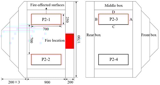 In the maintenance process of the FRP anti-collision floating pontoon of the continuous rigid-frame bridge’s P2 pier, an electric welding fire occurred. The main combustible materials in the fire were the float pontoon itself and the construction repair materials (Ashland vinyl ester resin). The fire lasted for approximately 2 h. After the fire broke out, water sprinklers were first used to extinguish the fire, followed by foam extinguishing to eliminate the source of the fire, and finally water sprinklers were used to cool down. The ignition point of the fire was in the middle section of the rear pontoon of the collision-resistant float pontoon, and the fire spread to the front pontoon and middle pontoon of the float pontoon, accompanied by a large amount of thick smoke. The inspection of the fire scene indicated that the collision-resistant float pontoon of the P2 pier was severely damaged and deformed, with the concrete surface of the P2 pier showing varying degrees of cracking, spalling, and exposed steel bars, corresponding to the damaged areas and the range of float pontoon burning. Based on the fire process, the condition of residual materials at the scene, and the extent of damage to the appearance of structural components, it can be concluded that the affected area of this fire accident mainly includes all four surfaces of the P2-1 pier and surfaces A, B, and D of the P2-2 and P2-3 piers, as shown in Figure 1.