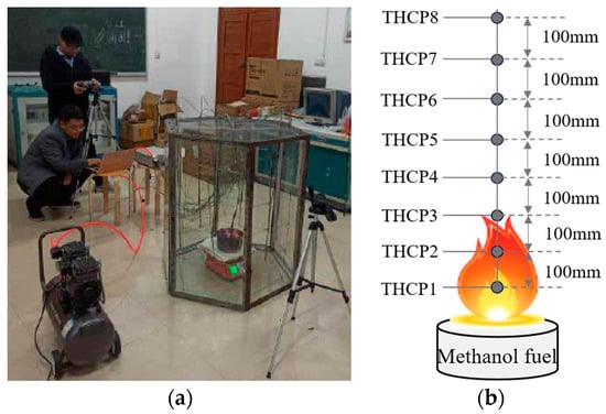 Methanol gasoline fuel pool fire experiments conducted in the literature. (a) The experimental site. (b) The layout of temperature measurement points.