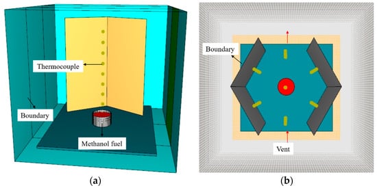 Using FDS to establish a CFD calculation model for methanol gasoline combustion that is identical to the literature experiment, the mesh boundaries of the model are set at 0.8 × 1.36 × 1.2 m. In order to balance computational accuracy and efficiency, multiple-zone mesh divisions are applied in the spatial domain, with an increased density of mesh near the key fire positions. Specifically, the mesh size near the fire source is set at 0.01 m, while other positions are set at 0.02 m. The total number of meshes is 9.71 × 105. Based on the experimental conditions, the heat release rate of the methanol gasoline combustion model is set at 8.1719 kW. Since the fuel mass in the experiment is constant, a fuel-controlled exponential growth model is used as the heat release rate growth function. The top surface of the calculation model is set as an open boundary, a pair of side surfaces are set as vent boundaries, and the remaining side surfaces are set as close boundaries, consistent with the experimental conditions. The wind speed is set from 0.1 to 4.0 m/s. The calculation model is shown in Figure 4.