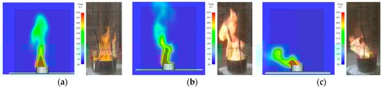 As shown in Figure 5, the combustion and smoke flow patterns of methanol gasoline obtained by CFD calculation are basically consistent with the experimental results, and the overall pattern is as follows: Under approximately no wind conditions (wind speed of 0.1 m/s), the smoke from the fire source mainly flows in the vertical direction, and the temperature distribution of the fire source is also in the vertical direction. Under certain wind conditions (wind speed of 1.0 m/s and 3.0 m/s), the smoke from the fire source mainly flows in the direction of wind speed, and the temperature distribution of the fire source is also influenced by the wind speed. In order to further verify the accuracy of the FDS calculation results, a comparison is made using a wind speed of 3 m/s, as shown in Figure 6.