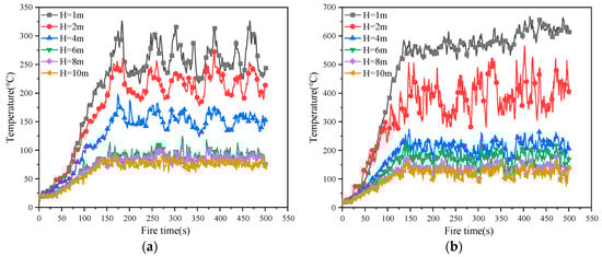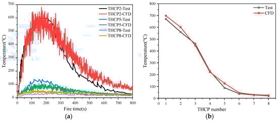 It can be seen from Figure 6 that the temperature rise curves of different measuring points calculated by the FDS 5.3 software are in good agreement with the experimental results. In addition, when the heat release rate of the fire source reaches its maximum (around 200 s of combustion time), the maximum temperature difference between the CFD calculation results and the test results is about 50 °C, with a temperature difference rate of approximately 8.3%. This indicates that using FDS 5.3 software to simulate the fire source combustion process has sufficient calculation accuracy.