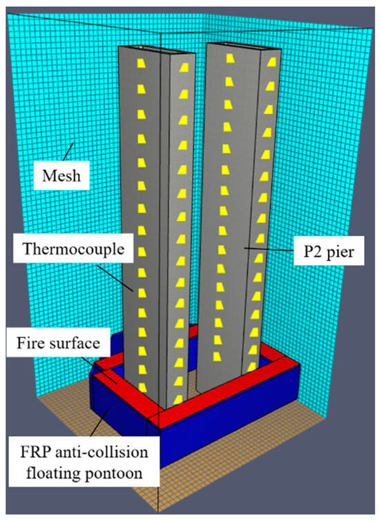 To simulate the fire and combustion scene of the FRP anti-collision floating pontoon on a continuous rigid-frame bridge pier, the FDS 5.3 software is used to establish a CFD calculation model for the combustion of the FRP anti-collision float pontoon, as shown in Figure 7. Based on the field investigation of the fire scene, the downstream side of the FRP anti-collision floating pontoon is more severely damaged and has a greater impact on the downstream of the P2 pier. Therefore, the downstream of the P2-1 and P2-2 piers is selected as the research object. Since the lower part of the bearing platform of the P2 pier is buried in the soil, the heights of the P2-1 and P2-2 piers are set at 35 m above the bearing platform (approximately the distance from the bearing platform to the top of the pier). The dimensions of the bridge pier and the FRP anti-collision floating pontoon are shown in Figure 1. The bridge pier is made of concrete, and the main material parameters are as follows: a density of 2280 kg/m³, specific heat capacity of 1.04 kJ/(kg K), thermal conductivity of 1.8 W/(mK), and radiation coefficient of 0.9 []. The FRP anti-collision floating pontoon is made of polyurethane rigid foam, and the main material parameters are as follows: a density of 28 kg/m³, specific heat capacity of 1.7 kJ/(kg K), thermal conductivity of 0.05 W/(mK), and radiation coefficient of 0.9 [].