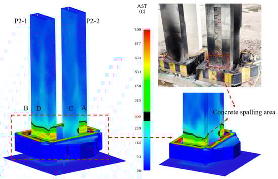 The transient temperature distribution of the FRP anti-collision floating pontoon in the event of a fire is calculated using FDS software and compared with the actual fire scene, as shown in Figure 8. The calculation was performed for a duration of 500 s, which simulated both the growth and steady stages of the fire in the FRP anti-collision floating pontoon, without considering the decay stage of the fire. From Figure 8, it can be observed that the temperature of the FRP anti-collision floating pontoon fire can reach 750 °C, causing the temperature on the surface of the P2 pier to exceed 650 °C. Research on the high-temperature spalling of concrete indicates that concrete is prone to spalling when the surface temperature is in the range of 200~500 °C. Therefore, it can be concluded that the FRP anti-collision floating pontoon fire can result in the spalling and peeling of the concrete of the P2 pier, and thus, the damage caused by the fire cannot be ignored. Taking 300 °C as the critical temperature for concrete spalling, it is determined that the FRP anti-collision floating pontoon fire causes concrete spalling in an area above the fire surface within a range of 6 m. The spalling mainly occurs on the A, B, and D surfaces of the P2-1 pier, while the inner C surface is minimally affected. Additionally, the CFD simulation results are consistent with the on-site detection results, demonstrating that the FDS software can accurately simulate the fire scenario of a continuous rigid-frame bridge with an FRP anti-collision floating pontoon.