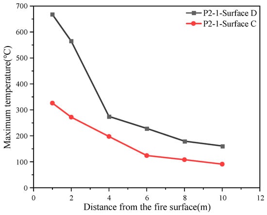 From Figure 9, it can be seen that the temperature rise pattern of different measuring points on the surface of the P2-1 pier are basically the same, with the temperature reaching its peak at around 150 s after being exposed to fire and then fluctuating near the peak. Comparing the temperature rise curves of different surfaces of the P2-1 pier, it can be concluded that the temperature of surface D is significantly higher than that of surface C. This is because surface D is the front surface facing directly towards the fire, while surface C is on the back side shielded by the pier leg and thus has a lower temperature. The highest temperatures on both surfaces C and D are located approximately 1 m above the fire surface, which is coincident with the flame height of the FRP anti-collision floating pontoon fire. Comparing the temperature rise curves at different measuring points, it can be noted that as the height increases, the temperature gradually decreases. To reflect the temperature distribution gradient along the height direction of the P2-1 pier, the variation curve of the highest temperature at each measuring point with height is plotted, as shown in Figure 10.