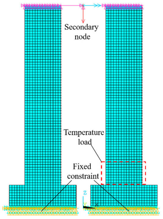 A numerical calculation model of the P2 pier of the continuous rigid-frame bridge is established using ANSYS 17.0 software, as shown in Figure 11. The calculation model uses SOLID70 elements for thermal analysis and SOLID185 elements for structural analysis. The temperature load range for thermal analysis is set at 6 m above the bearing platform, and the load size is determined by the temperature rise process at the H = 1 m measuring point in Section 3.3. For structural analysis, the load is taken as the load transmitted by the upper structure to the pier top and the weight of the pier itself. The pier top internal forces under the condition of the completed bridge are calculated using Midas Civil 2022 software. The load is mainly considered as dead load (self-weight + second phase) and live load (vehicle load + crowd load + temperature load), and the load combination is based on the ultimate limit state of bearing capacity. The axial force, shear force, and bending moment at the top of the P2 pier under the completed bridge state are calculated to be 74,991 kN, 1411 kN, and 31,614 kN·m, respectively. An auxiliary node is established at the pier top, and the ‘*CERIG’ command is used to form a rigid domain between the auxiliary node and the pier top node. The internal forces of the completed bridge are applied to the auxiliary node to avoid stress concentration at the pier top.