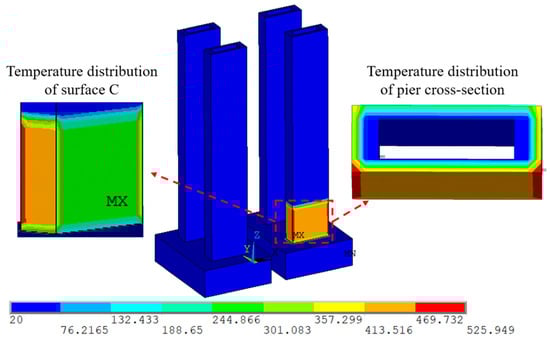 The indirect coupling method is used in the thermal–structural coupling method to conduct the thermodynamic response analysis of the P2 pier under the FRP anti-collision floating pontoon fire. The analysis approach of the indirect coupling method is as follows: Firstly, the structural heat transfer analysis is carried out. The heat boundary conditions of the structure subjected to fire are defined, and the material heat transfer parameters are input to calculate the temperature field distribution of the structure under fire. Secondly, the structural stress analysis is carried out. The structural load and boundary conditions are defined, and the thermal analysis calculation results are read in to calculate the mechanical response of the structure. The results of the temperature distribution and temperature rise process of the P2-1 pier are shown in Figure 12 and Figure 13.