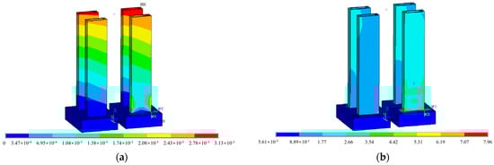 Cloud maps of deformation and equivalent yield stress distribution of P2 pier. (a) Deformation cloud map (unit: m). (b) Equivalent yield stress distribution map (unit: MPa).
