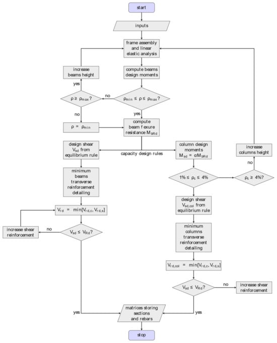 Hence, transverse and longitudinal reinforcement bars, respectively, for beams and columns are computed according to the equilibrium constraints and capacity design rules, as a function of beams’ resisting moments MbRd. Namely, the former could be retrieved by imposing the equality of shear actions VbSd with the shear resistance VbRd computed according to the shear resistance model proposed by the Italian Building Code. The columns’ flexural design is instead performed by first computing the acting bending moment McSd by multiplying the beams’ resisting moments MbRd by an incremental factor α to comply with the “weak beam–strong column” principle. Even in this case, if the design column longitudinal reinforcement ratio ρlc exceeds the upper bound limit ρmax, the columns’ size would be increased, thus implying the design process to be restarted from the beginning. On the contrary, if ρlc stands within the lower and upper bound limits (ρmin, ρmax), the procedure allows us to compute the columns’ resisting moments McRd, and in turn, the acting shear demand VcSd via the equilibrium constraints. The last step is to calculate the columns’ transverse reinforcement and to account for the code prescriptions in terms of the reinforcement detailing to ensure the achievement of the desired ductility class. Hence, all the seismic rules provided by the Code have been satisfied and the developed procedure guarantees the ductile behavior of the size frames.