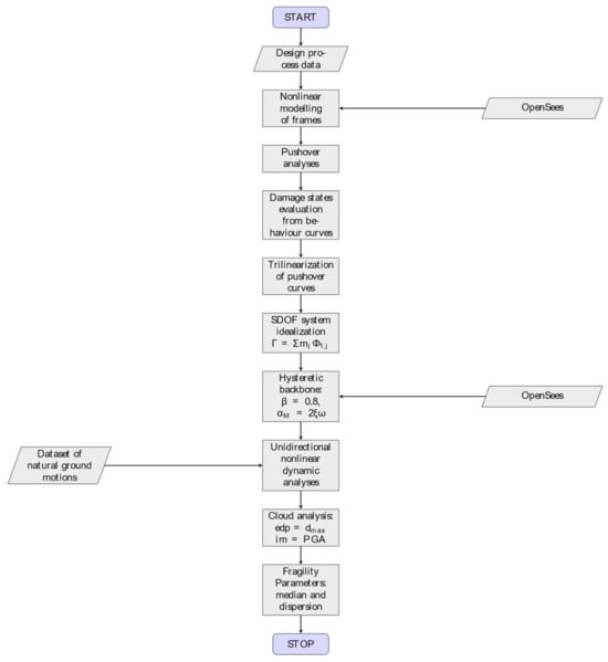 Once designed, the code-compliant frames are assessed for the relevant performance levels to quantify the related fragility curves, as shown in Figure 2. To accomplish this, a further seismic fragility assessment procedure has been implemented. As a first step, the outputs of the seismic design procedure are used as input data to build the Multi-Degree of Freedom (MDOF) numerical non-linear model of the frames in OpenSees environment. These means that a proper script has been developed in order to assemble the numerical model, starting from the outcomes stored at the end of the design process.