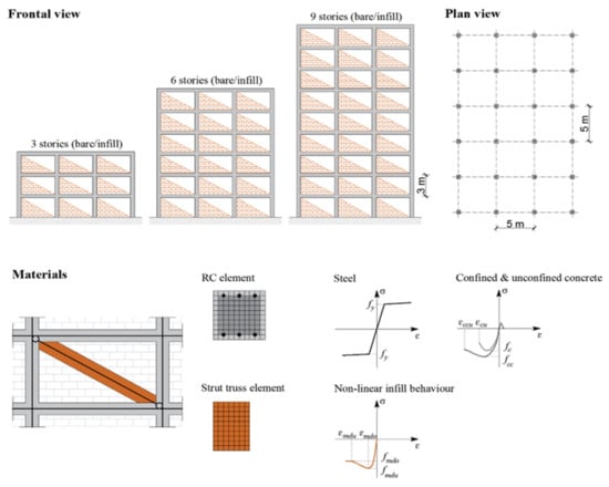A lumped plasticity modeling technique with plastic hinges calibrated via a fiber cross-section discretization modeling strategy with non-linear stress–strain material laws is adopted. The elements’ and joints’ shear failure mechanisms are neglected since the fulfilment of the code prescriptions (i.e., the capacity design rule) implicitly avoids their occurrence. For this reason, the adopted modeling strategy aims to represent the flexural behavior of the RC frames. The masonry infills are modeled with equivalent struts in order to capture the increase in stiffness of the structure considered as a whole, as caused by the interaction of the masonry panels with the RC frame.