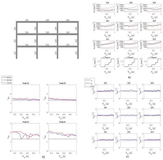 Seismic design outputs for the 3-storey code-conforming configuration: (a) beams’ longitudinal reinforcement and columns’ section area, (b) nodes’ overstrength factors and (c) beams’ overstrength factors.