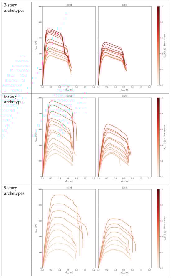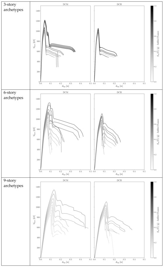 The resulting sizing is later used in combination with the non-linear material models as input for the automatized construction of the non-linear structural model in the OpenSees environment to carry out pushover analyses. Figure 5 and Figure 6 illustrate the capacity curves resulting from the pushover analyses derived according to [], respectively, for all the RC bare and infilled archetypes as a function of the increasing Sae(T1) values.
