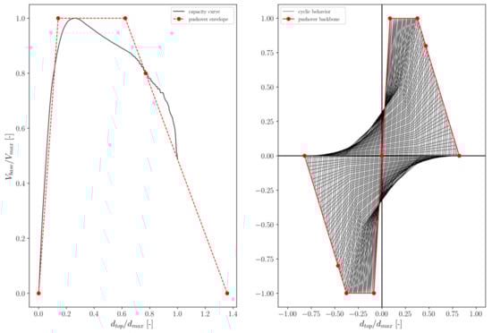 Therefore, the SDOF systems have been characterized by means of a trilinearized backbone starting from the capacity curves of the frames. This strategy has already been widely adopted in the literature []; in particular, it has followed the approach contained in []. Specifically, the force-displacement behavior has a first elastic portion and a second perfectly plastic branch, which precedes the last linear descending phase. The relevant points have been calibrated using the principle of equal areas between the capacity curves and the idealized one, and then the first modal participation factor Γ has been used to switch from the MDOF system to the SDOF one. As noted in Figure 7, the force at the first and second points is fixed equal to the maximum base shear, while the ‘yield displacement’ is derived by equalizing the area ranging from the initial point to the one mentioned. Hence, the ‘post-capping’ trend is determined similarly. Subsequently, the dynamic behavior of the equivalent SDOF has been recreated with a hysteretic peak-orientated model in the OpenSees environment to be able to perform the vulnerability assessment. Finally, it should be noted that, for simplicity, a damping ζ proportional to the mass matrix has been set.