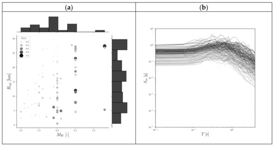 A dataset containing the ground motion records and the desirable damage states to obtain the fragility curves has been assembled by collecting a group of 200 unscaled records belonging to the 2 horizontal components of 100 different seismic events. This dataset has been built up with an Mw-Repi criterium that is consistent with the seismic disaggregation process. Specifically, a range of variation for the magnitude and epicentral distance has been fixed, and for each step, a series of five events has been collected. However, it should be underlined that increasing the magnitude detrimentally decreases the number of events; thus, for high-intensity events, the selection switched from five to two. Hence, a sample of uniformly spatial events has been obtained, as reported in Figure 8.