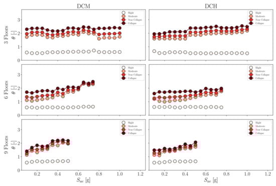 Therefore, all the non-linear dynamic analyses could be performed for each elevation configuration, ductility class, and elastic spectral acceleration Sae(T1) to obtain the fragility parameters θ and σ for each damage state previously defined. To this end, Figure 9 presents the correlation between the median of the vulnerability θ and the elastic spectral acceleration Sae of a generic construction site.