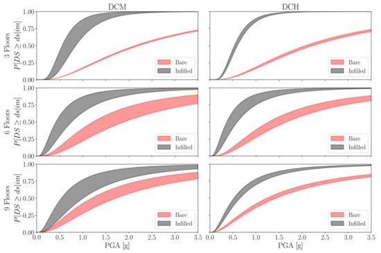 The almost steady trend in the median values for the 3-story layouts leads to a strict bundle of curves, while for the other stories, the increasing trend of the median according to the elastic spectral acceleration results in a wider scatter of the fragilities. Thereafter, these results have been compared to those obtained for the bare frames in order to detect how the stiffening of the infills affects the vulnerability. Hence, Figure 10 compares the regions of minimum and maximum fragility between the bare and infilled layouts, referring to the near collapse damage state; thus, the greater vulnerability of the second case is highlighted.