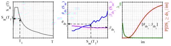 The fragility parameters θ and β are subsequently obtained for each DS of interest. The fragility curves are then computed and later coupled with the seismic hazard curve of the site of interest to obtain the seismic failure rate λf accordingly to Equation (2). As regards the seismic hazard, a MATLAB routine is implemented to automatically reproduce code UHSs for a generic site of interest. The UHSs are first computed on soil category A (i.e., rock-like geological formation, including at most 3 m of weaker material at the surface, with an average shear-wave velocity VS,eq of the upper 30 m higher than 800 m/s) and then amplified with the topographic–stratigraphic amplification coefficient S in accordance with the Italian Building Code [] for considering the specific soil condition.