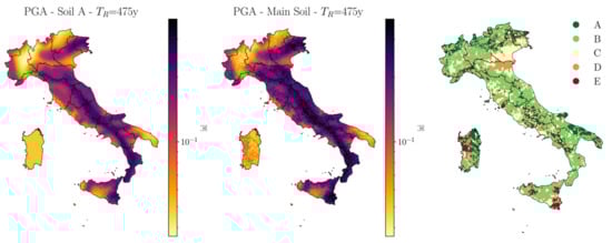 Figure 12 plots both the seismic hazard map with a ground acceleration of the 50-year exceedance probability computed at the bedrock and the one determined by assuming the effective soil condition in each site. Hence, this figure outlines the strong effect of considering the soil condition on the spatial distribution of the seismic hazard. For instance, the high amplification factor of soil categories C or D spreads the seismic hazard of the sites in the northeast of Italy in such a way that they reach values of intensity measure similar to those of the well-known locations in the center of Italy.