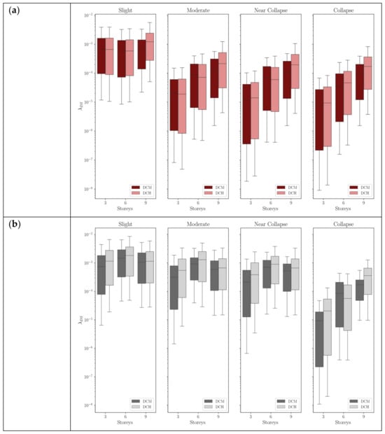 Seismic failure rates boxplot for the (a) bare-frame and (b) infilled-frame configurations.