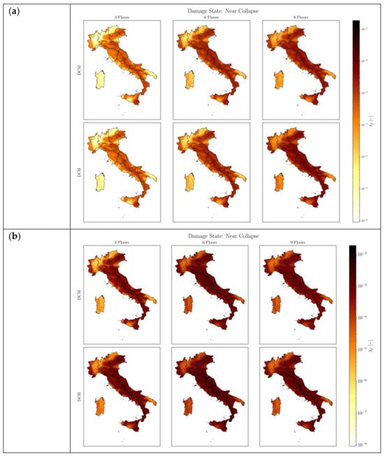 Code-compliant seismic failure rates maps for the near-collapse (NC) damage state: (a) bare frames and (b) infilled frames.
