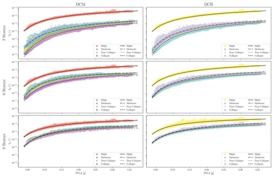 where ε is a normal random variable with zero mean and unit variance, σ represents the standard deviation of the model error, and k0, k1 and k2 are the model parameters calibrated to minimize the interpolation error. The analytical formulation was inspired by the functional form used to fit the seismic hazard curves, given that the numerical results demonstrated how the resulting seismic failure rates for Italian code-conforming RC frame buildings appear strongly correlated with the seismic hazard estimates. Figure 15 shows the seismic failure rate vs. design PGA regression models fitted for the analyzed 3-, 6- and 9-story bare frames, whereas Table 3 and Table 4 list the main parameters of the λf—the design PGA regression models for both the bare and infilled layouts, respectively.