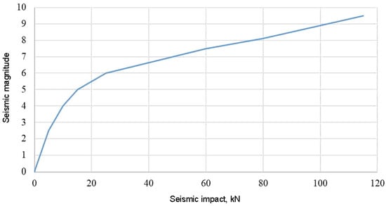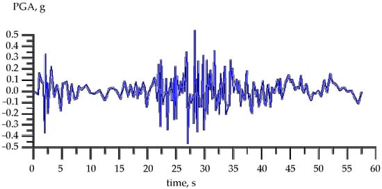 A detailed specification of the initial seismicity of HPP and TPP sites was carried out using Probabilistic Seismic Hazard Analysis (PSHA) [,,,,,]. The method is based on the estimation of the probability of exceeding a given level of earthquake-induced ground motion at a given point during a given future time period. The product of this analysis is a hazard curve: the dependence of the probability of exceedance on the level of movement. The CRISIS 2015 program was used to directly calculate the impact values [], developed at the National University of Mexico. The program is freely distributed and regularly updated. CRISIS works with all types of sources and contains in its database most of the known attenuation models up to 2014. In 2015–2016, the CRISIS program was tested at the Pacific Earthquake Engineering Research Center (USA), where it was compared with well-known software, in particular PSHA. The results of the seismic calculations are presented in Table 1. An example of one of the synthesized accelerograms is shown in Figure 1.