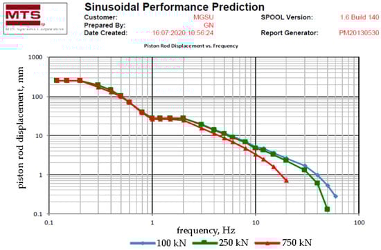 - MTS-brand hydraulic cylinders (Figure 3), designed to create alternating dynamic action with different acceleration at each stage of loading from 0.2 m/s2 to 4 m/s2, with a frequency from 1 to 50 Hz, displacement amplitude from ±50 to ±250 mm, and maximum force at alternating dynamic action of ±800 kN. The rod displacement was monitored using an LVDT-type displacement sensor. The amplitude–frequency characteristic is presented in Figure 4.