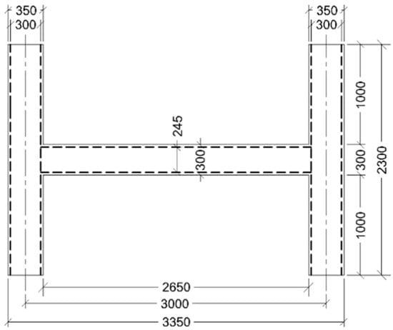Geometric dimensions of reinforced concrete models: ––––––––— boundaries of reinforced concrete model; – – – – – –— boundaries of reinforcement installation. Column dimensions: 2300 × 350 × 200 mm; floor transom dimensions: 2650 × 300 × 200 mm.