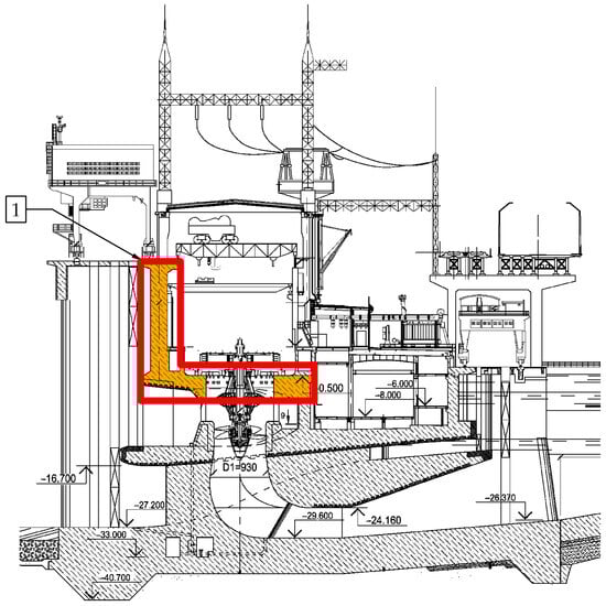General view of the building of the run-of-river hydroelectric power plant: 1—head bearing wall with overlap.