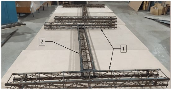 Reinforcement carcass of reinforced concrete frame model: 1—reinforcement of the wall (columns) model; 2—reinforcement of the floor (transom) model.