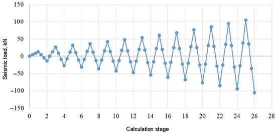 - The initial composite-strengthened reinforced concrete model failed at a seismic impact of 115 kN, which was 1.9 times higher than the non-strengthened reinforced concrete model and corresponded to magnitude 9.5 MSK-64 (Figure 13).